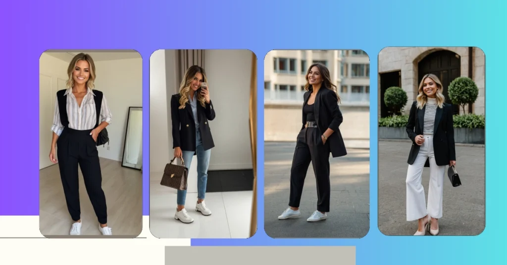Want to look professional but also like you’re ready to break into a spontaneous samba at any moment? This outfit’s got you covered! It’s got the fancy pants and stylish top for meetings, but those cool sneakers add a touch of fun, like you’re secretly a dance superstar in disguise.