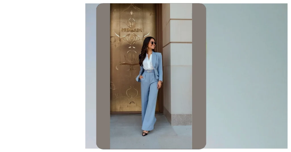 Imagine showing up to work in this outfit! Talk about making an entrance, especially if you added some upbeat samba music as you strutted in. You would be the coolest boss (or intern) ever! This isn’t your boring old office wear; it’s like a power suit had a baby with a vacation vibe, all thanks to that rad light blue color.