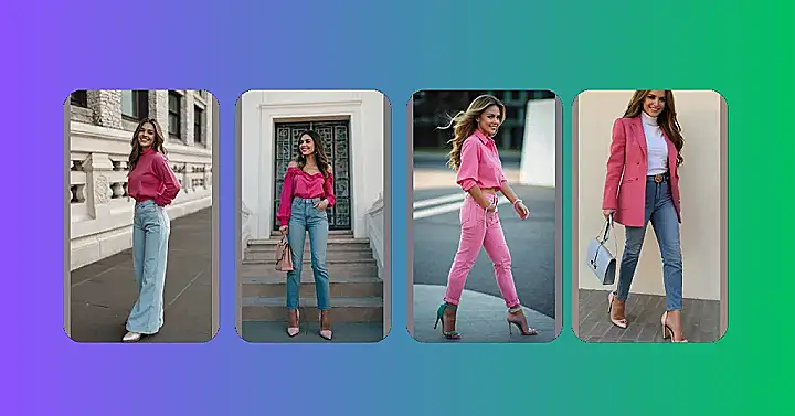 So, you’re rocking pink! This outfit totally proves that you don’t need to be a flamingo to pull off this colour. The light blue jeans are a fun twist, like a breath of fresh air in a sea of ordinary denim. Seriously, who needs boring when you can have a pink explosion of awesomeness? This outfit is all about having fun with your style and showing off your personality.