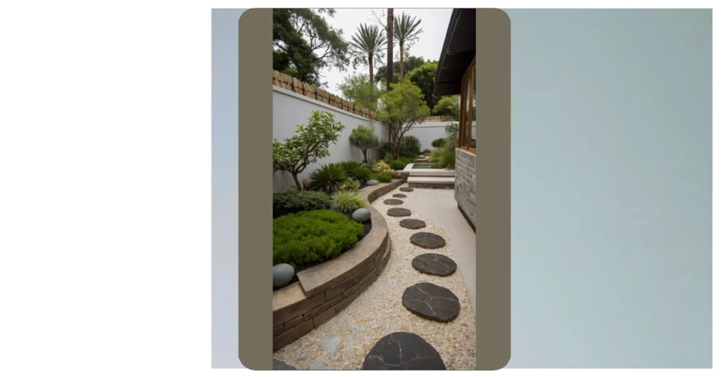 Seriously, look at that cool stone pathway and all the neat little plants popping up! It’s way more interesting than just plain old dirt. Plus, there are big rocks scattered around like someone just decided to drop some giant pebbles for decoration, and it totally works. This garden isn’t trying too hard, it just looks naturally awesome and inviting. Grab a book, grab a friend, or just grab some sun – this Italian-inspired courtyard is basically begging you to kick back and take it easy.