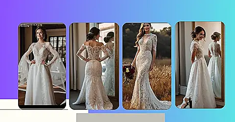 Okay, so check out this wedding dress! It’s giving off major bohemian vibes, like she’s about to run off and start a band with a bunch of woodland creatures (in a good way, of course!). Seriously, those sleeves look like they could catch butterflies, and the whole lace thing is like a fancy forest fairy threw up all over it… again, a compliment! You could totally wear this to a beach wedding, a music festival, or maybe even just to your next history class to liven things up!