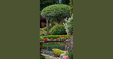 This picture is like stepping into a fairytale! Imagine a peaceful pond, perfectly reflecting the vibrant colours of the flowers all around it. It’s like the garden itself is dreaming, with a giant, fluffy green tree acting as a watchful guardian over a rainbow of blossoms. This is what dreams are made of – a totally chill spot to relax and maybe even spot a friendly frog taking a dip.