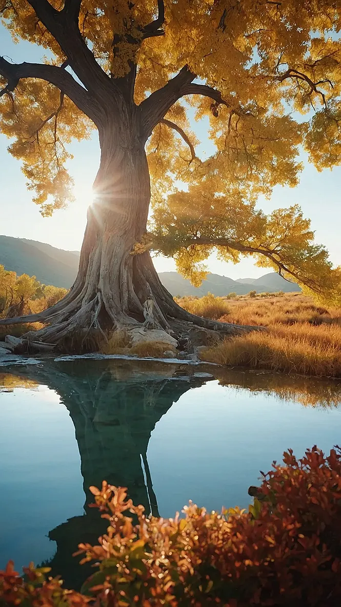 This picture is like a scene from a fairytale! A giant tree with golden leaves stands proudly by a crystal-clear pond. The sun is shining through the branches, making everything sparkle like a thousand tiny diamonds. It’s like the tree is holding a mirror to the sky, and the pond is showing off its most beautiful reflection.
