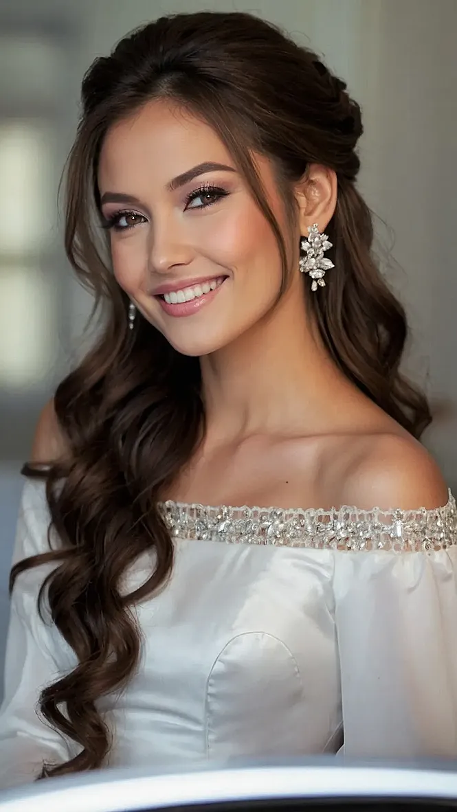This hairstyle is like a classic wedding dress – it’s beautiful and timeless. It’s a half-up, half-down style, meaning it’s not too fussy (no need to worry about your hair falling out during the first dance!). The loose curls and the cute little sparkly clip make it look super elegant without being over the top. Think of it like the perfect blend of princess-worthy and chill vibes.