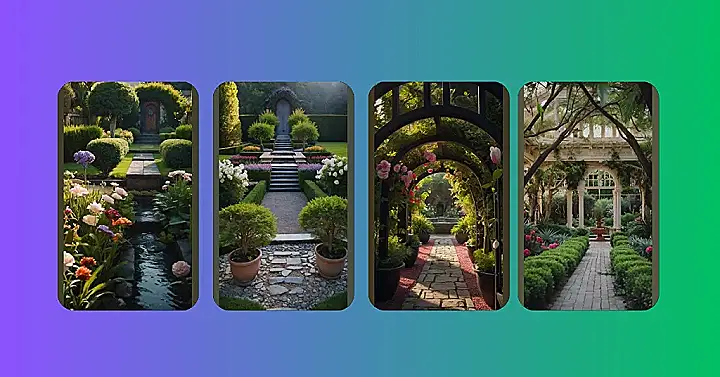 This garden is like something out of a fairytale! It’s got everything a dreamy garden needs: lush greenery, colorful flowers, and a path that whispers secrets to those who walk it. Imagine being a little gnome, peeking out from behind a rosebush, and seeing a stone path winding its way toward a magical fountain. You could almost hear the tinkling music of fairies as they flit about, spreading their magic through the air. It’s the kind of place where you could wander for hours, lost in the beauty of the world around you.