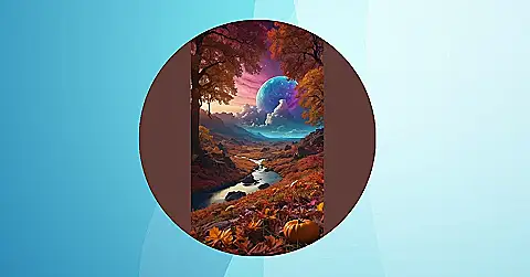 This picture looks like a magical place you might find in a dream. The colors are so vibrant, and the giant, swirling moon hanging in the sky makes it feel like a whole different planet! Imagine walking along the river, crunching on the colorful leaves under your feet, and watching the clouds drift by. It’s like an autumn wonderland!