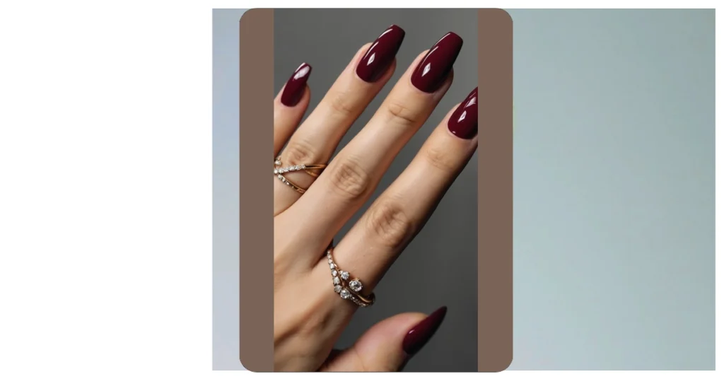 These nails are like a cozy sweater on a chilly fall day ‚Äì they’re warm, inviting, and just the right amount of “extra”. The deep burgundy color is perfect for the season and gives off a sophisticated vibe without being too over-the-top. It’s like a classic fall outfit that’s always in style.