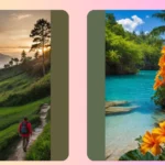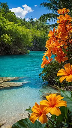 Look at this place! The water is so ridiculously blue it looks like someone spilled giant paint pots all over the jungle. And seriously, those bright orange flowers are basically screaming “ditch your textbooks!” Seeing this definitely makes you question why you’re currently doing anything less exciting, like, you know, doing chores or maybe attempting to understand quadratic equations. This picture is pure travel inspo fuel, making your regular everyday feel just a tiny bit boring in comparison to this tropical dream.