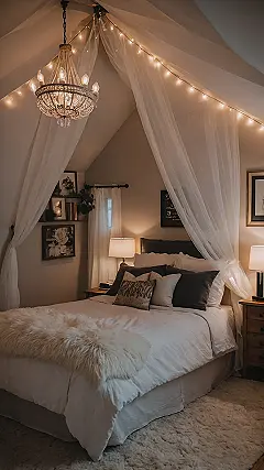 This bedroom is basically a masterclass in how to make leaving your bed feel like a personal betrayal. Look at that fancy sheer stuff draped over the top, held up by twinkle lights! It’s like a fairytale fort for when you just can’t adult today. Plus, that fluffy chandelier is probably secretly casting spells to keep you snuggled up forever. It’s the ultimate cozy headquarters for forgetting your to-do list exists.