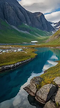 Wow, take a look at this place! Itβs like someone threw a giant snowball fight party and forgot to clean up, but in the most awesome, massive way possible. Those huge, snowy mountains in the background look like theyβve been chilling there forever, literally. Down here, the water is so blue it almost doesn’t look real, dotted with icy bits that are probably way too cold to touch. And those rocks scattered around? They seem to be holding their ground, maybe giving the cold shoulder (get it?) to all that snow piling up around them. This is the kind of beautiful arctic landscape that makes you want to grab a hot chocolate and just stare.