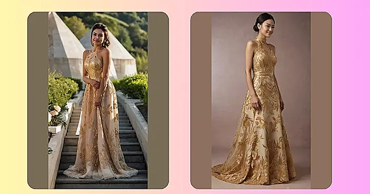 This gold wedding dress is seriously stunning! Imagine walking down the aisle, feeling like a total queen in this gorgeous gown. It’s like a princess fairy tale come to life—all shimmery gold details on a fluffy, dreamy dress. You’d totally be the most radiant bride ever, shining brighter than the actual gold! It’s the perfect dress for anyone who wants to feel extra special and magical on their big day.