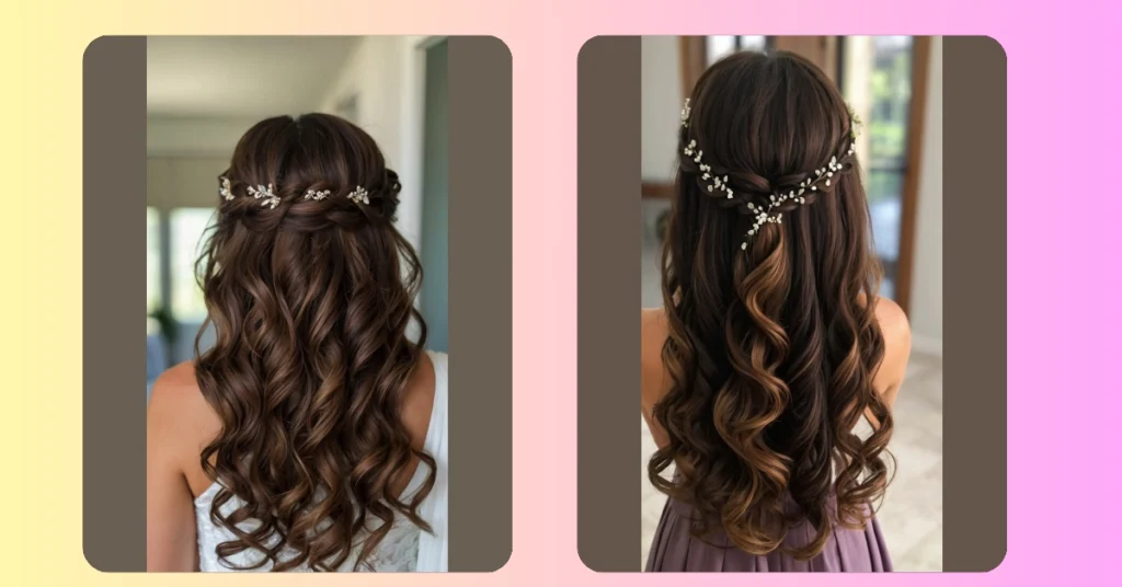 This hairstyle is like a fairytale come to life! Imagine yourself as a bridesmaid, looking absolutely stunning with these gorgeous, bouncy curls cascading down your back. It’s like a chocolate waterfall with a sparkly crown—the tiny flowers add a touch of magic, making you look like you stepped out of a princess movie. Forget the tiara, this subtle sparkle is way more chic!