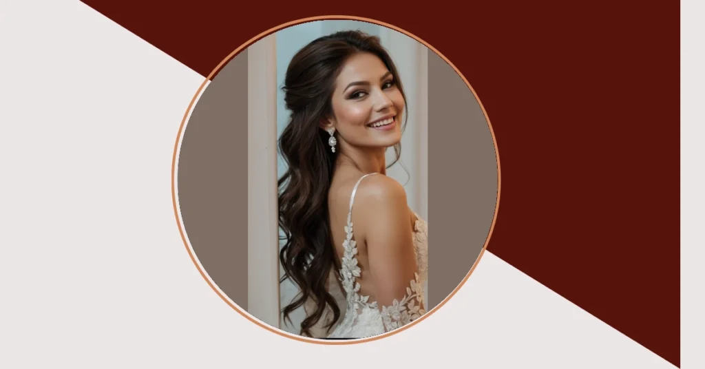 The picture shows a bride with long, luscious hair, styled in a way that’s totally on-trend and effortlessly chic. She’s got some of her hair pulled back, showing off her beautiful face, and the rest falls in loose, flowing waves. There’s a sparkly little hairpiece adding a touch of glam, and it’s like, “Hey, I’m getting married, and I’m going to look amazing while doing it!” It’s the kind of hairstyle that’s perfect for a wedding – it’s elegant without being stuffy, and it’s really flattering on any face shape. It’s basically the ultimate “I’m a princess, but I’m also cool” look, and who doesn’t want that on their big day?