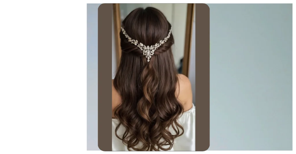 Seriously, who needs a tiara when you’ve got this? The half-up part adds some serious volume and makes the waves look even more amazing. Plus, that sparkling hair accessory is the cherry on top – it adds just the right amount of “wow” factor without being too over-the-top. This hairstyle is so stunning, it’s practically a work of art!