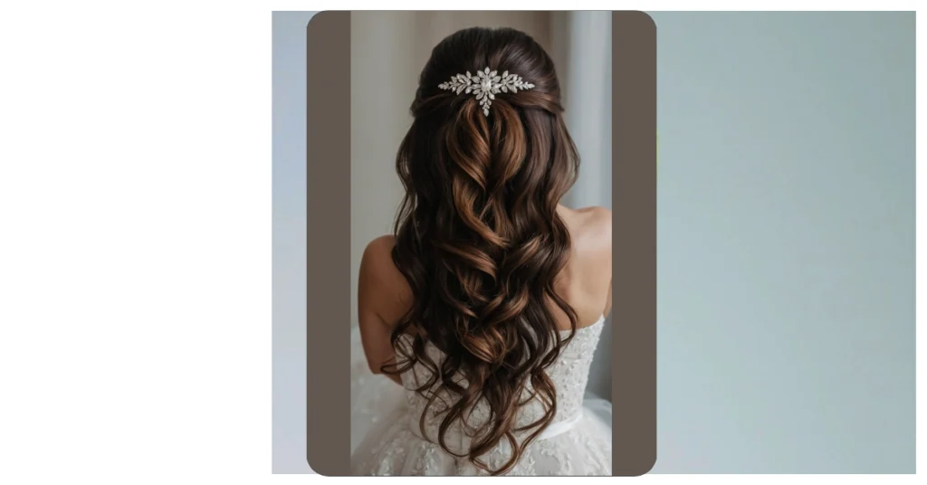 Deciding on a hairstyle for a big day, like maybe your future wedding or just a fancy event, can feel like trying to choose your favorite snack – impossible! But the ‘half up, half down’ style is basically the genius move that says, “Why pick when you can have both?” It’s like getting the elegance award because the top part is all neat and tidy, showing off a cool sparkly accessory like the one in the picture, while the rest of your hair gets to hang out and show off those awesome waves. Seriously, it’s the hairstyle equivalent of wearing sweatpants with a fancy blazer.
