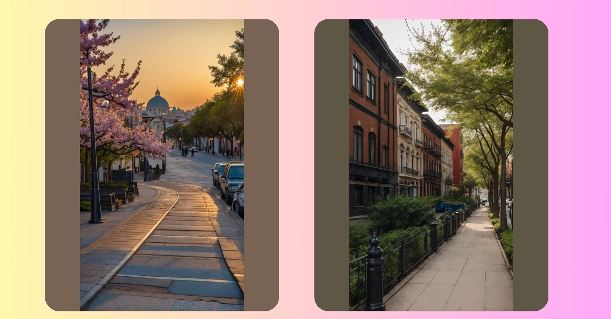 Finding a chill spot in the city can feel like hunting for a legendary treasure map instead of just trying to enjoy a walk. But seriously, feast your eyes on this scene! The sun’s setting in a riot of warm colors, making everything glow like it’s covered in a golden filter, and those cherry trees are just going wild with pink blossoms. It’s like the concrete jungle decided to put on a fancy outfit and invited everyone for a peaceful stroll, proving that ‘serene city locations’ are totally real and not just something your nature-loving aunt talks about.