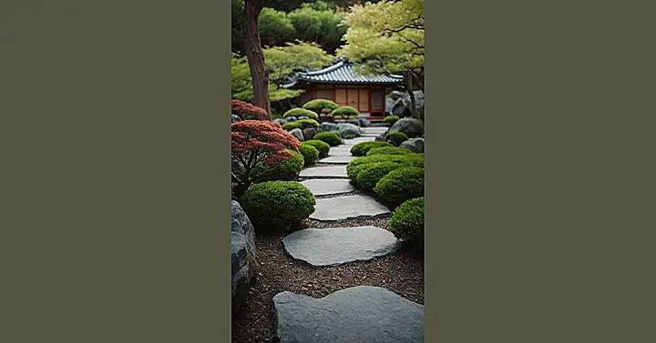 This Japanese garden looks like a place where you could really relax and find your inner peace. There’s a little house in the back, which could be where the wise old gardener lives. The path is made of big, flat stones, perfect for taking slow, mindful steps. Imagine yourself walking on those stones, feeling the cool rock beneath your feet and hearing the wind rustle through the leaves.