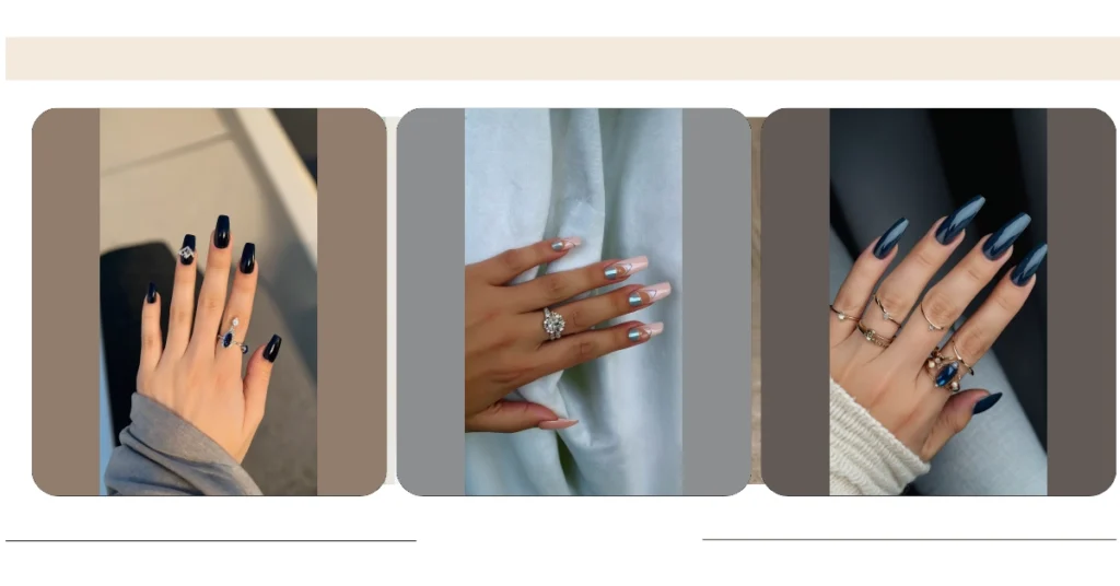 These nails are totally rocking the December holiday spirit, even if they’re ditching the usual red and green! That deep, dark blue is like a midnight sky on a crisp winter night, perfect for cozying up by the fire with hot cocoa. And those sparkly rings? They’re like little snowflakes catching the light – seriously glamorous! Who needs mistletoe when you have these beauties?