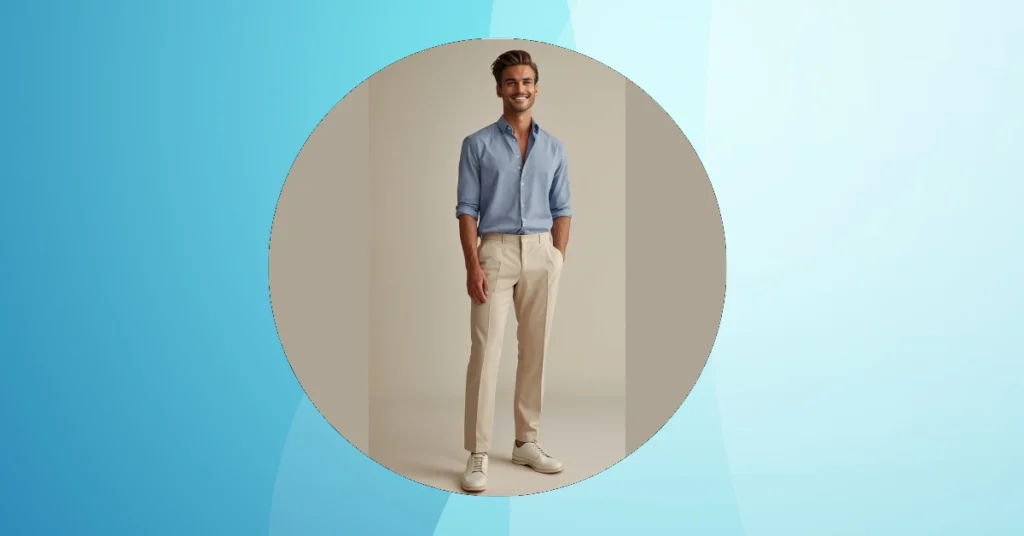 Forget the cheesy cards and chocolates, this Valentine’s Day, impress your date with some serious style! This outfit is the perfect blend of cool and casual – a light blue button-down shirt, crisp beige trousers, and clean white sneakers. It’s comfortable enough to be yourself, but put-together enough to show you care. Think effortless charm, not awkward sweat-stained shirts!