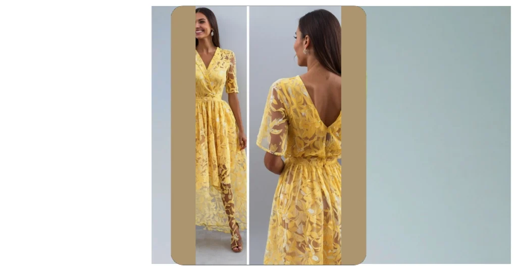 Imagine walking into a room wearing this dress! You’d be the centre of attention, glowing in your sunny yellow outfit. It’s like wearing a piece of summer, even when it’s cold outside! You could pair it with sandals for a casual look or dress it up with heels for a more formal occasion. Whatever you do, you’ll be sure to turn heads in this vibrant and light dress!