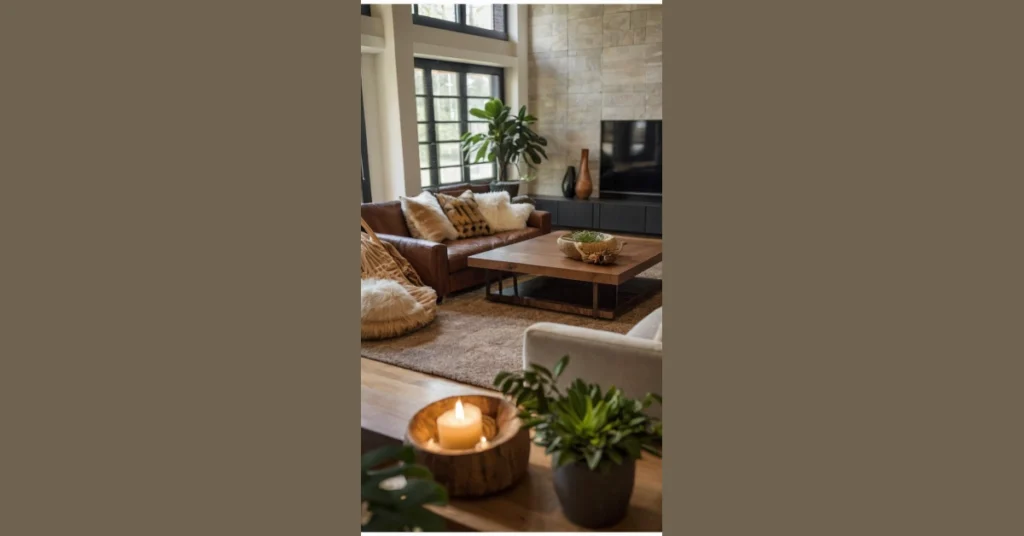 This living room is seriously chill. Imagine sinking into that comfy leather couch, surrounded by fluffy pillows and plants that look like they’re straight out of a jungle. It’s got that perfect mix of natural materials—like the wood coffee table and the cozy rug—and modern furniture, making it super stylish without being too stuffy. It’s the kind of place where you could easily spend hours reading a book, watching a movie, or just hanging out with friends, all while feeling totally relaxed and connected to nature.