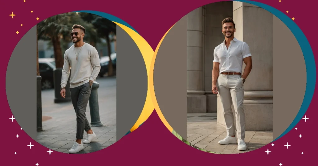 This guy’s outfit is total goals! Imagine strolling down the street looking this effortlessly stylish. He’s rocking a comfy cream sweater – perfect for those chill days – paired with some sharp grey pants. The white sneakers add a pop of freshness, and let’s be honest, who doesn’t love a good pair of comfy kicks? It’s the kind of outfit that says, “I’m cool, calm, and collected,” but also “ready for anything!” It’s the perfect example of men’s fashion casual outfits done right – simple, stylish, and seriously enviable.