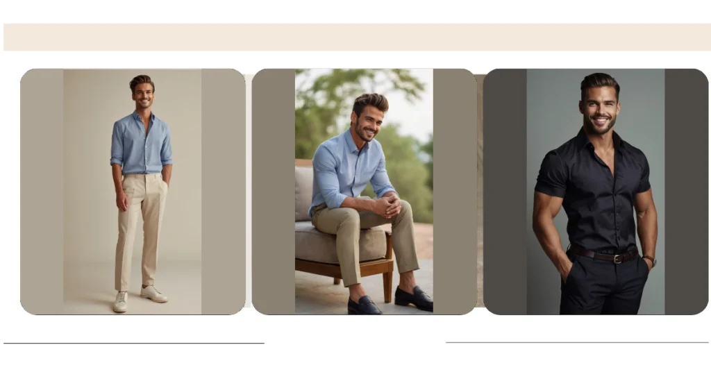 Forget the cheesy cards and chocolates, this Valentine’s Day, impress your date with some serious style! This outfit is the perfect blend of cool and casual – a light blue button-down shirt, crisp beige trousers, and clean white sneakers. It’s comfortable enough to be yourself, but put-together enough to show you care. Think effortless charm, not awkward sweat-stained shirts!