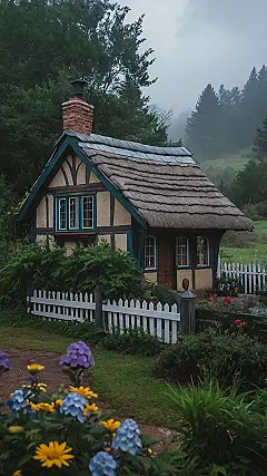 This adorable little cottage looks like it popped right out of a fairytale! It’s nestled in a misty forest, surrounded by lush greenery. The thatched roof, the charming windows, and the stone path leading to the front door all scream “storybook cottage.” It’s the kind of place where you imagine a friendly gnome might be hiding behind a flower pot or a mischievous fairy might be flitting through the air.
