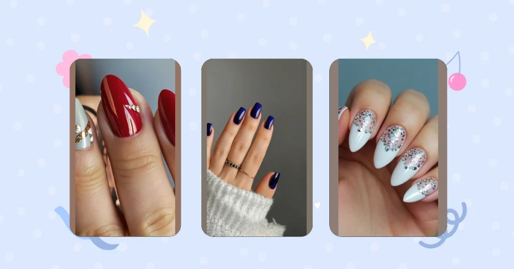 Those nails are seriously glam! We’ve got a super chic combo of a deep, rich red – perfect for cozy nights by the fire – and a frosty, sophisticated light grey. It’s like a wintery fairytale on your fingertips! The tiny sparkly gems add just the right amount of “bling” without being too over-the-top. Imagine sipping hot cocoa with these beauties – talk about a stylish winter upgrade!