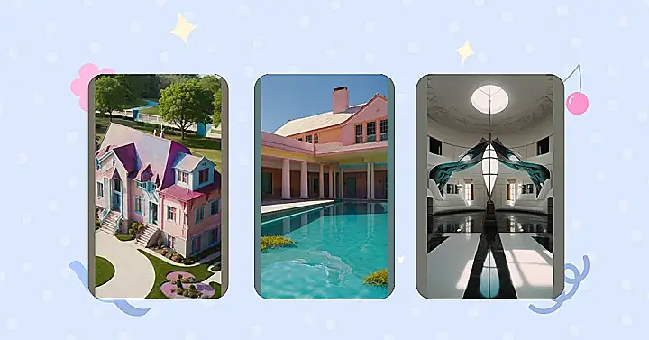 This house is like a giant box of crayons exploded all over! It’s got pink, brown, yellow, and even white – it’s like a rainbow, but on a house. It’s got so many windows that it looks like it’s trying to show off its fancy interior. And what about that little pond in front? It’s like a giant mirror reflecting all the colors of the house, making it even more colorful!