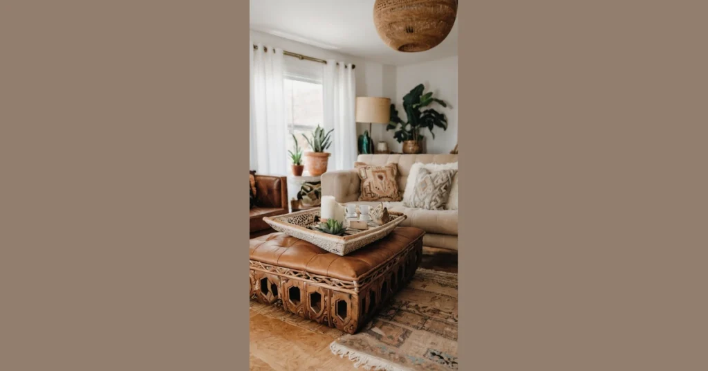 **Paragraph 1:** Step into this totally rad boho living room! It’s like stepping into a magazine spread, but way cooler. Look at that awesome leather ottoman – it’s like a comfy throne fit for a queen (or a king who loves plants). The whole place is decked out in earthy tones – think browns, creams, and the kind of beige that makes you want to snuggle up with a good book. Those pillows? They’re practically begging you to flop down and have a chill sesh. Seriously, this room screams “relax and unwind,” which, let’s be honest, is exactly what we all need sometimes.