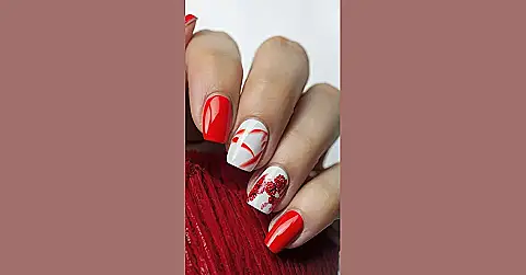 These nails are seriously adorable! Imagine showing up to your Valentine’s Day dance with these beauties. The mix of classic red polish with the delicate, pretty red floral design on a white background is totally perfect for a romantic day (or any day, let’s be honest!). It’s like a little burst of Valentine’s Day cheer on your fingertips – way better than a boring, plain manicure, right?