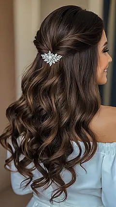 This isn’t just any hairstyle, it’s a masterpiece! Imagine your hair as a waterfall of soft, shiny curls, cascading down your back like a luxurious chocolate fountain. And to top it all off, there’s this gorgeous sparkly hairpiece, like a miniature crown, that adds a touch of regal elegance. It’s the perfect way to make a statement at any fancy event, from a prom night to a fancy wedding. It’s like wearing a little bit of magic in your hair.