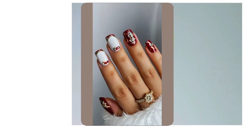 Hey there, nail fanatics! Check out these super cute Christmas nails – they’re totally trendy and giving me all the festive feels! It’s like a tiny winter wonderland on your fingertips. Imagine showing up to the Christmas party with these bad boys – everyone will be asking where you got them. The combo of the classic red and white with the sparkly gold accents is just *chef’s kiss*. Plus, those little painted designs? Seriously adorable. They’re not too over-the-top, but still super festive, perfect for showing off your holiday spirit without looking like you went overboard (unless you want to!).