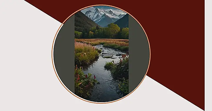 This photo is like a postcard from a fairy tale! A crystal clear stream winds its way through a valley, surrounded by lush green trees and tall mountains. The mountains look like they’re wearing fluffy white hats, because they’re covered in snow. It’s so peaceful and serene, you can almost hear the gentle babbling of the water and the rustling of leaves in the breeze.