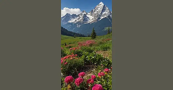 Isn’t it awesome how nature puts on a show? It’s like the mountains are the cool older brothers, all tall and covered in snow, while the flowers are the spunky younger siblings, bursting with color and demanding attention. You’ve got these massive, majestic peaks towering over everything, giving off serious “king of the world” vibes, then BAM! – a field of flowers pops up like a surprise party.