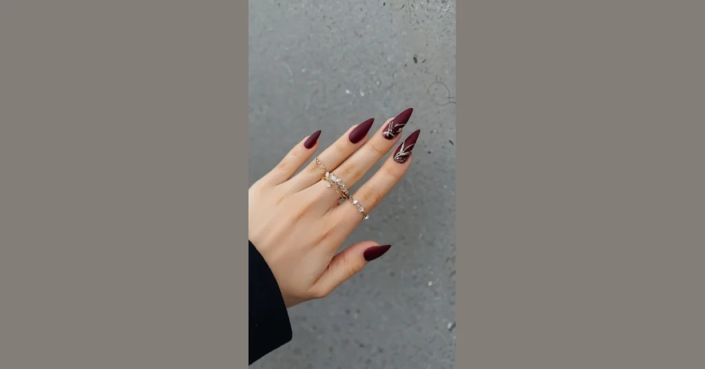 These nails are seriously giving us all the fall vibes! Just imagine sipping pumpkin spice lattes and wearing your favorite cozy sweaters with these gorgeous burgundy nails. The little gold accents are like the sprinkles on top of a pumpkin pie – they add a touch of fun and sophistication to the whole look. Think of them as the perfect accessory for your next autumn adventure!