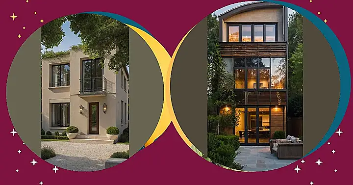 This house looks like it’s ready for a baguette-eating contest on the balcony! It has a cool, modern vibe mixed with a touch of classic French style, making it fancy but not stuffy. The tall windows and the balcony are just perfect for dramatic entrances and exits, especially if you have a beret and a really good French accent!