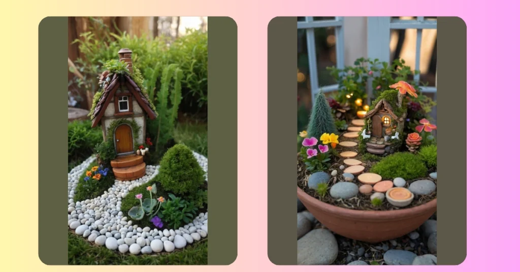 Seriously, who wouldn’t want to shrink down and live there? The miniature flowers and tiny mushrooms surrounding the house really set the mood, like they’re having a never-ending garden party. Think about adding a little tea set, or maybe even a tiny pool filled with sparkly water beads for extra fairy fabulousness! You could totally win “Fairy Gardener of the Year” with a design this sweet.