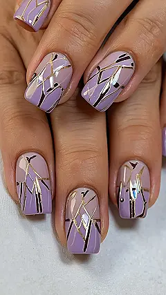 These nails are so pretty, they’re practically royalty! Rocking that elegant purple shade with a cool gold pattern that looks like shattered glass – but in a super stylish way, not like you just dropped your phone…again. If you’re looking to level up your nail game from basic to boujee, this is the look.
