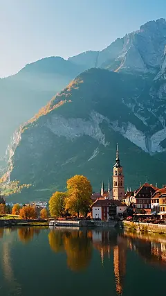 This picture is like a postcard from a fairytale! Imagine walking down the cobbled streets of this adorable little town, nestled snugly at the foot of a giant, sleepy mountain. It looks like the kind of place where everyone knows your name and the only traffic jams are caused by adorable fluffy sheep. You could spend all day exploring the charming houses, maybe even getting a sweet treat from a local bakery, and then watch the sun set over the mirror-like lake. So peaceful!