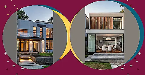 This renovated house is like something out of a magazine! It’s totally modern, with sleek grey stone and big windows that let in tons of light. Imagine having those awesome balconies, perfect for summer evenings with friends, or just chilling and reading a book. The inside looks super comfy too, with colourful couches and a stylish light fixture – it’s definitely a place where you’d want to hang out and relax!