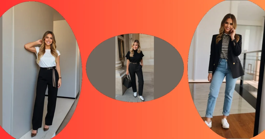 Want to look professional but also like you’re ready to break into a spontaneous samba at any moment? This outfit’s got you covered! It’s got the fancy pants and stylish top for meetings, but those cool sneakers add a touch of fun, like you’re secretly a dance superstar in disguise.