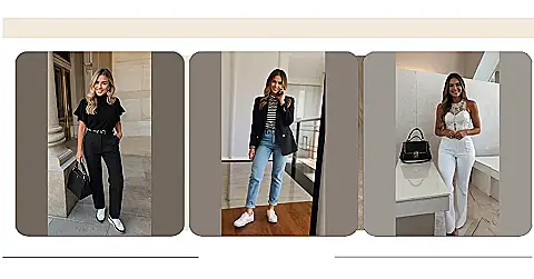 Want to look professional but also like you’re ready to break into a spontaneous samba at any moment? This outfit’s got you covered! It’s got the fancy pants and stylish top for meetings, but those cool sneakers add a touch of fun, like you’re secretly a dance superstar in disguise.
