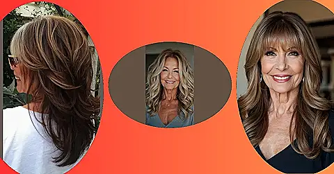 The picture shows a woman who’s rocking a hairstyle that’s totally on trend. It’s called “layered hair” because it has different lengths of hair, making it look super cool and stylish. And guess what? It works perfectly for anyone over 50!