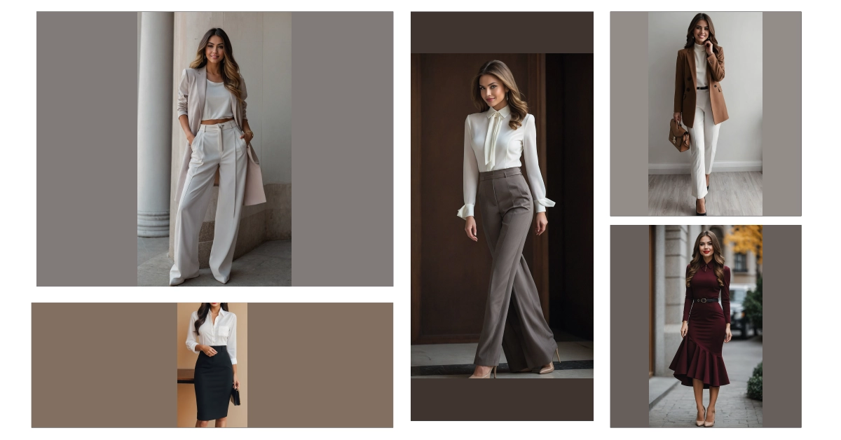 See how those pants almost swish when she walks? That’s the kind of drama we need in our workwear! It’s like you’re making an entrance everywhere you go, even just walking to the water cooler. Plus, that little tie on the blouse is a fancy touch that says, “I’m serious about my work, but also, look, I can tie a knot!” Dressing formally can actually be fun, making you feel a little more confident and ready to tackle your tasks, maybe even with a tiny bit of a superhero vibe going on.