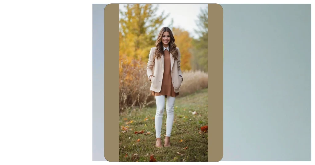 The brown hues of the sweater and blazer match the changing leaves, and the white jeans make your legs look super long. It’s a perfect blend of comfort and style. So grab your favorite bottle (and maybe a cute tote bag) and get ready to have some fun! Just don’t forget to wear comfy shoes, because you’re gonna be doing a lot of walking and talking (and hopefully, laughing)!