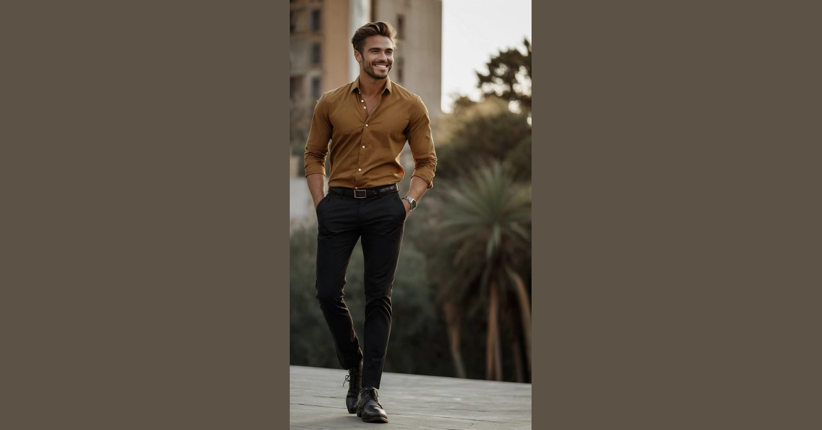 This guy’s outfit is seriously sharp! He’s rocking that perfect gentleman look with a mustard-colored shirt and sleek black pants. It’s like he stepped straight out of a movie, ready to charm his way through any situation. Think James Bond meets your super-cool history teacher – except way less likely to assign homework. It’s the perfect blend of sophisticated and effortlessly stylish; you could totally wear this to a school dance or a fancy family dinner.