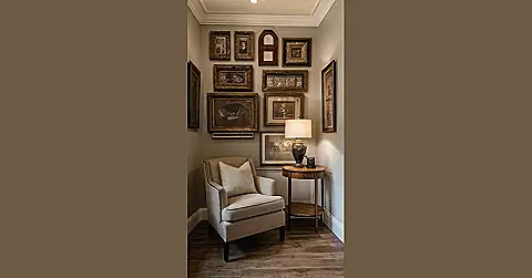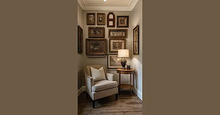 This corner is like stepping into a time capsule! Imagine all the stories hidden behind those vintage frames. It’s like the wall itself is whispering secrets from the past—maybe about fancy parties, awkward family photos, or even a mischievous pet causing chaos. That comfy chair looks perfect for curling up with a good book and letting your imagination run wild with all the potential tales those old pictures could tell. It’s a totally awesome vintage frame gallery wall, a perfect blend of history and chill vibes.