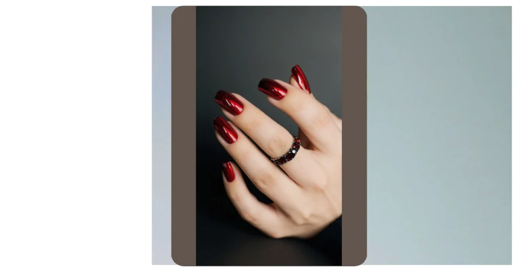 These nails are the perfect shade of dark wine red – so rich and sophisticated, they practically shout “I’m ready for a fancy dinner, but also totally down for pizza night!” That gorgeous ring just adds to the whole glamorous vibe. It’s like the nails and ring are best friends, going out together to steal the spotlight.